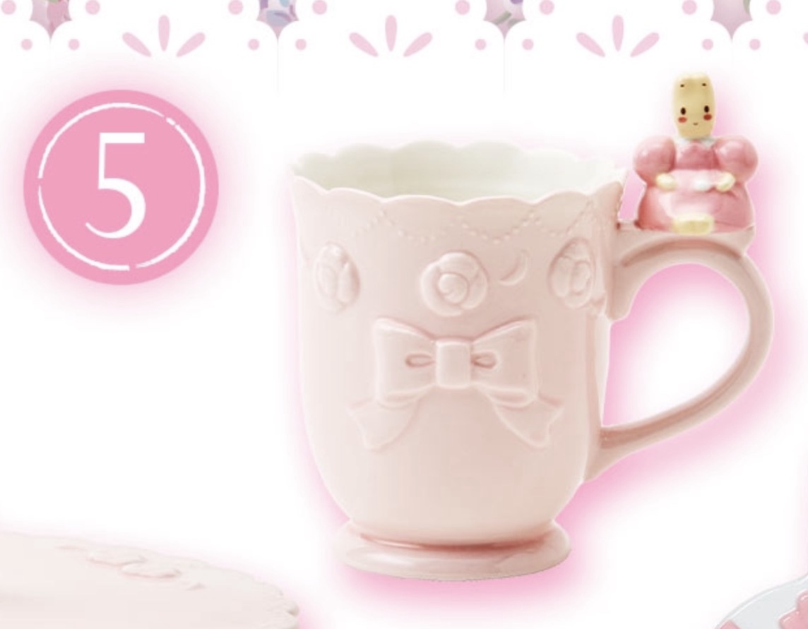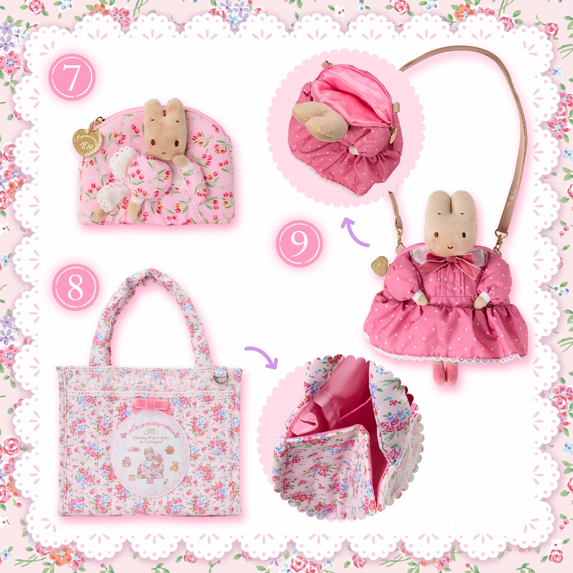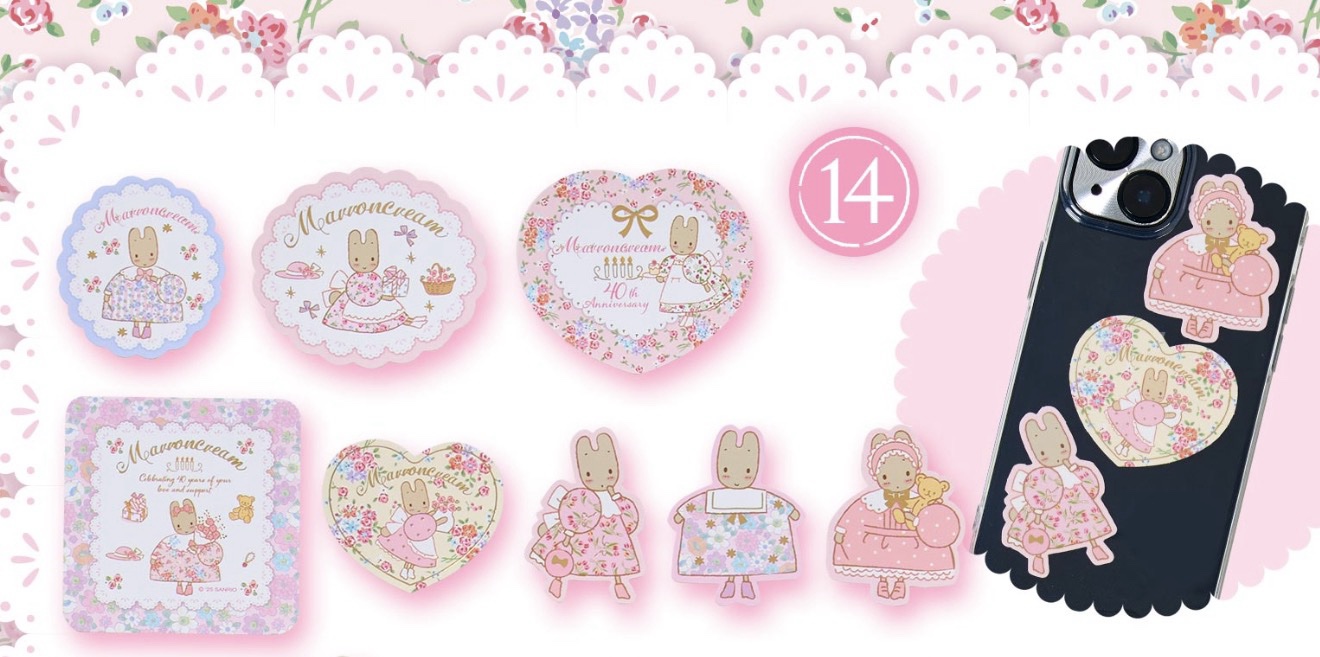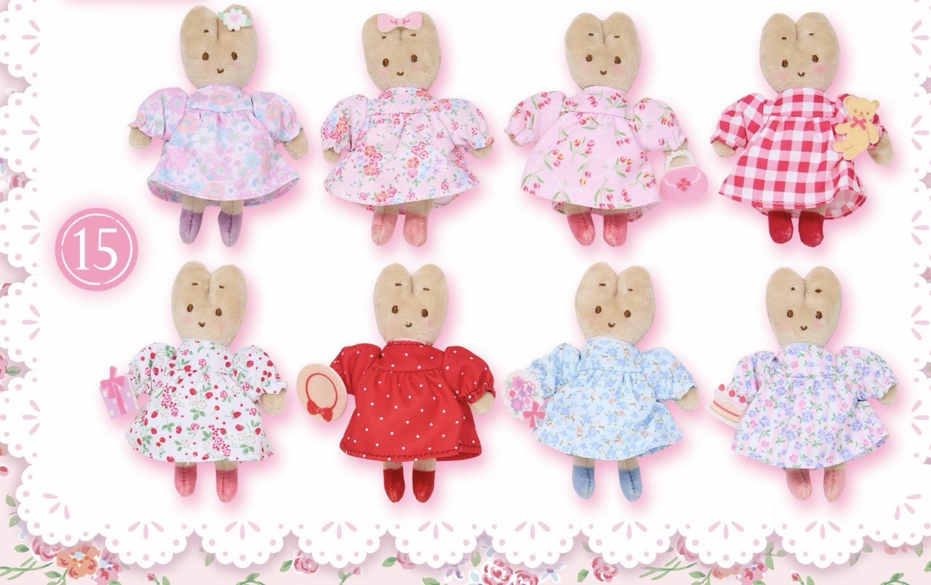 栗子奶油茉莉兔玩偶, 紫色挂件, 白粉色挂件, 蛋糕架, 杯子, 甜品碟套装, 纸巾包, 托特包, 斜挎包, 束口袋两个, 方巾, 梳子镜子套装, 胸针套装, 贴纸套装, 玩偶胸针盲盒随机一个